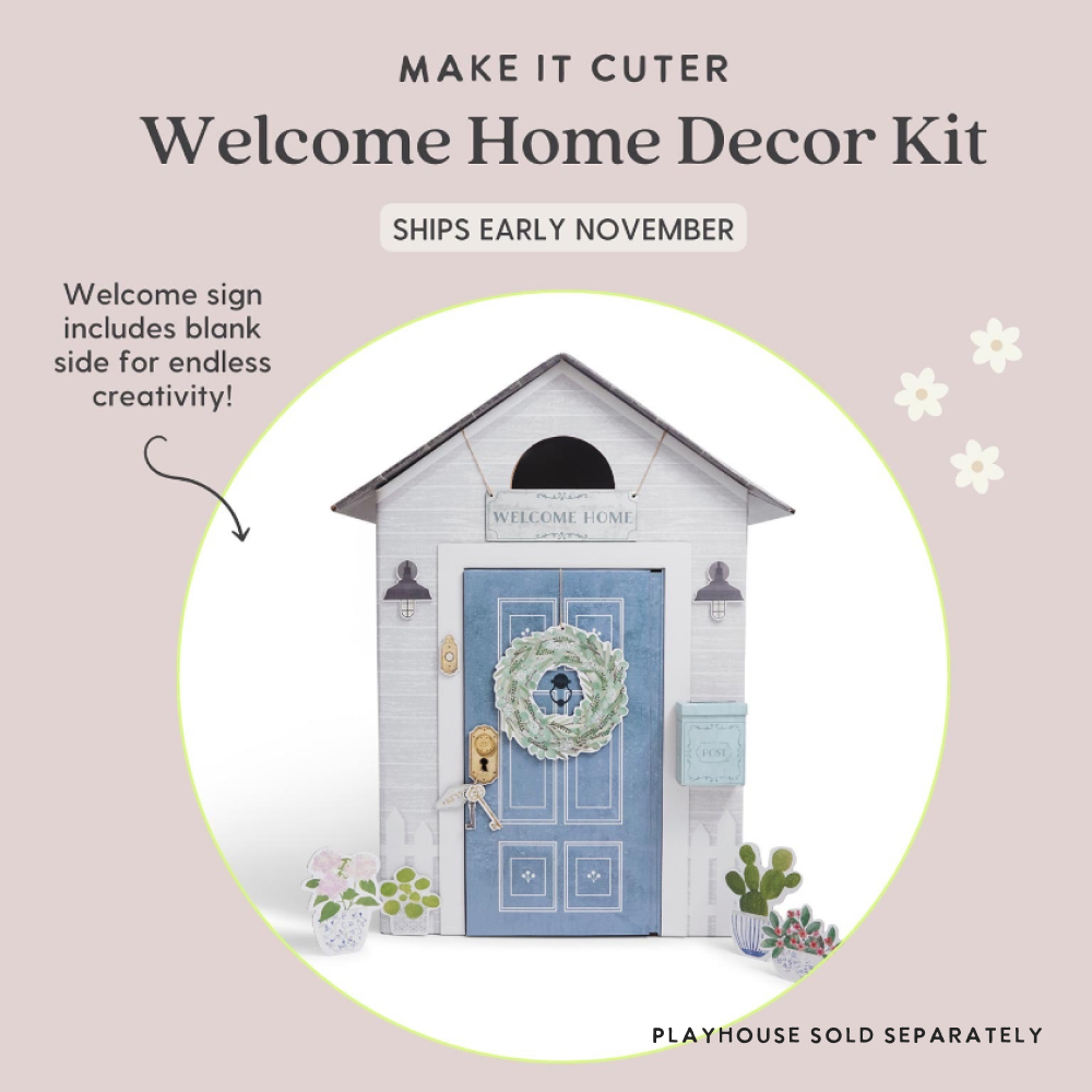 Perfect for transforming your child’s playhouse into an even warmer and more inviting space, our "Make It Cuter: Welcome Home" decor kit brings the magic of home to life. Featuring a charming assortment of eco-friendly decorations, including an adorable wreath, a customizable welcome sign, and a whimsical mailbox with stationery, this kit is designed to inspire imaginative play and create a cozy environment. Each piece is made from sustainable materials, ensuring that your child's new home away from home is both fun and environmentally friendly. Watch as your little one's playhouse becomes a beloved retreat, fostering creativity and nurturing developmental growth with every welcoming detail.
